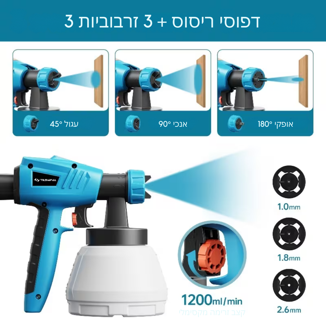 אפשרויות ריסוס: 3 דפוסי ריסוס (אופקי, אנכי, מעגלי) & 3 גדלי פיות (φ1.0, φ1.8, φ2.6 מ"מ).