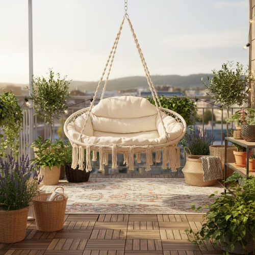 ™Levshiel הוא כיסא נדנדה בעבודת יד בסגנון מקרמה, עשוי חבל עמיד עם כרית עבה, המעוצב בסגנון בוהו. מושלם להרפיה, משלב נוחות עם קסם אומנותי, ויוצר פינת ישיבה ייחודית בבית או בחוץ. מעוצב ונוח, מושלם לחדרי שינה, מרפסות, פטיו או סלונים.